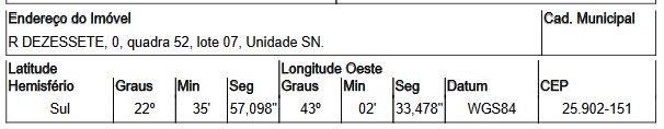 moradia. RUA DEZESSETE,N. S/N QD 52, LT 07, NOVA MARILIA - CEP: 25902-151, MAGE - RIO DE JANEIRO