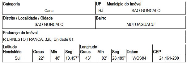 Localização: Casa em Endereço: RUA ERNESTO FRANCA | Bairro: MUTUAGUACU | Número: N. 325 CS 01 SAO GONCALO - RJ