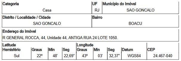 Localização: Casa em Endereço: RUA GENERAL ROCCA | Bairro: BOACU | Número: N. 44 SAO GONCALO - RJ